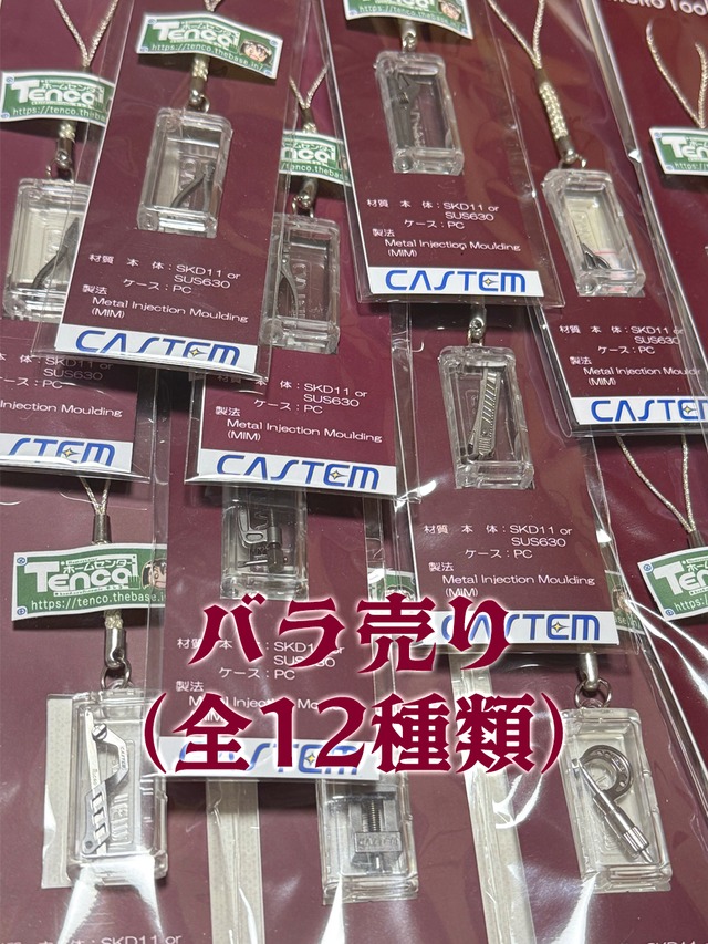 ミニチュア工具11点(はさみ/プライヤー/マシンバイス/ウォーターポンププライヤー/ラジオペンチ/ミニノギス/マイクロメータ/弓のこ/ニッパー/シャコ万/モンキーレンチ)を専用のケースに収めたセットです。ミニチュア工具の製造方法の解説も入った冊子「ホームセンターてんこEx.2キャステム編」と工具を1つずつ持ち歩きするためのプラケースがオマケについています。 素材はSKD11、SUS630などの高硬度金属です。硬質金メッキ(Au-CO)24金メッキを施しています。(金純度99.7%以上なので正確には23.928金になります) 名刺が3枚くらい(?)入れられます。取引先でチラリと見せれば商談も盛り上がることでしょう。 (※イベントでの価格は15,000円)