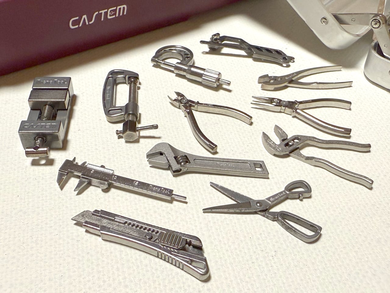 「Micro Tool」「CASTEM」の微細刻印が入り、ノギスのデプスが付いたりハサミの刃が曲線になるなど、より実際の工具に近い形にブラッシュアップされています。素材はSKD11、SUS630などの高硬度金属です。