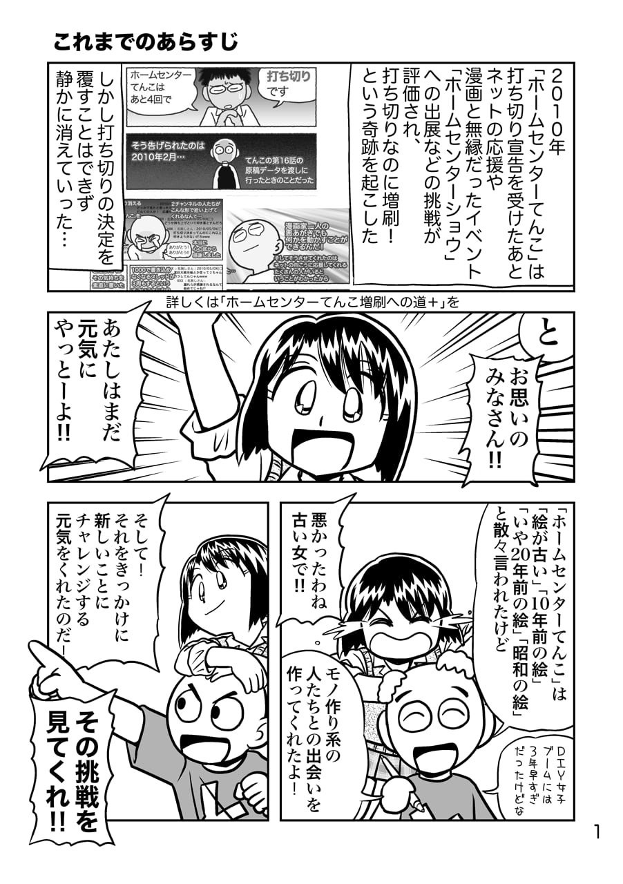 雑誌連載していた「ホームセンターてんこ」の打ち切りが決まってから増刷されるまでのドキュメント。そして、増刷はされても連載は予定通り終わってしまうのでその先の展開もあります。